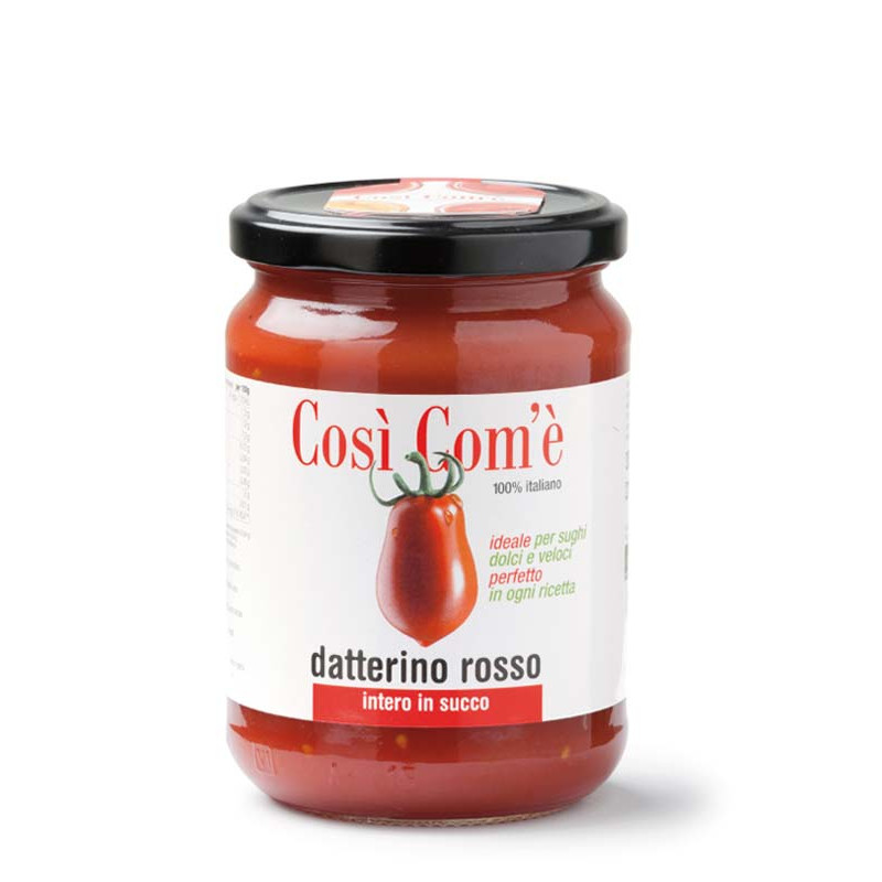 Pomodori “Datterini” rossi (di origine italiana provenienti da produzione integrata), succo di pomodoro (di origine italiana proveniente da produzione integrata).